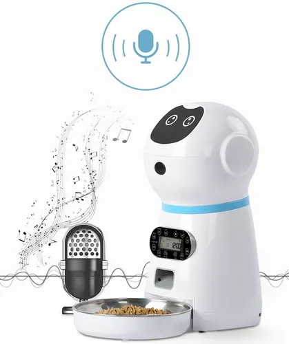 4) Grabadora-Puede presionar y grabar su voz para recordarle a su mascota que coma. Este mensaje de voz dura 10 segundos. El comedero inteligente para mascotas se activará automáticamente 3 veces antes de cada comida para recordarles que coman regularmente, se mantengan saludables y se sientan relajados cuando no estén en casa.